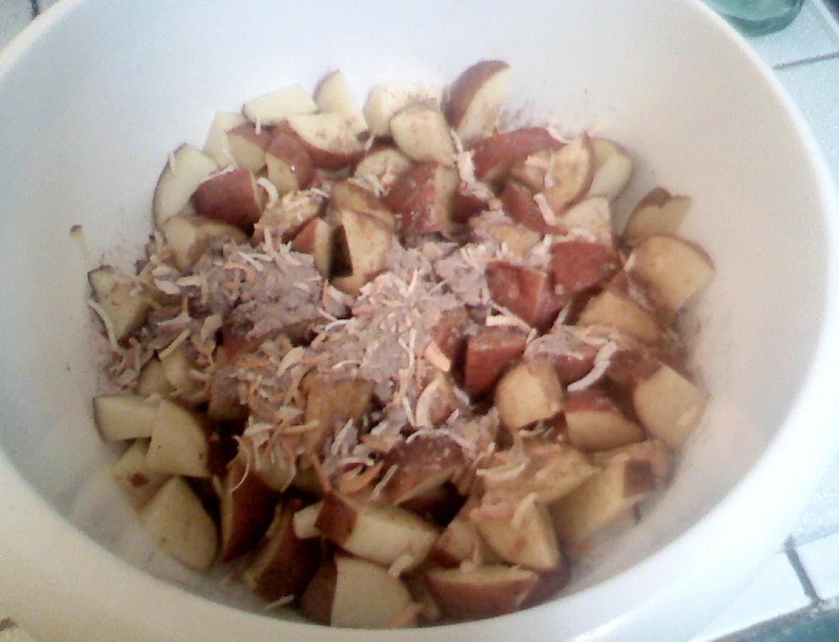 Pierce potatoes with a fork. Microwave on for 13 minutes or until tender. Cut in half and let cool slightly. While the potatoes cook, heat oil in a large saucepan over medium-high heat. Add onion and sauté for 3 minutes.